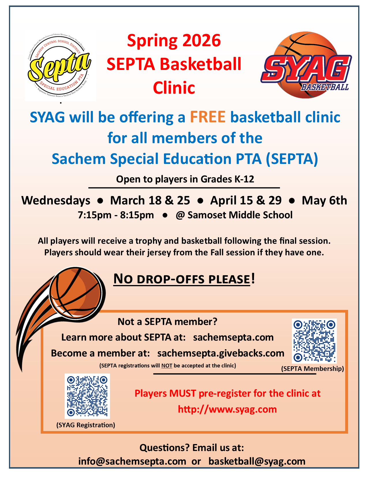 Each year, SYAG Basketball, in cooperation with the Sachem Special Education PTA (SEPTA), offers a free basketball clinic for SEPTA families with children in grades K - 12. We are happy to announce that this program will be returning for the Spring 2026 season on March 18, March 25, April 15, April 29, and May 6. For more information, please email the SEPTA coordinator at [email protected] or our basketball program at [email protected]