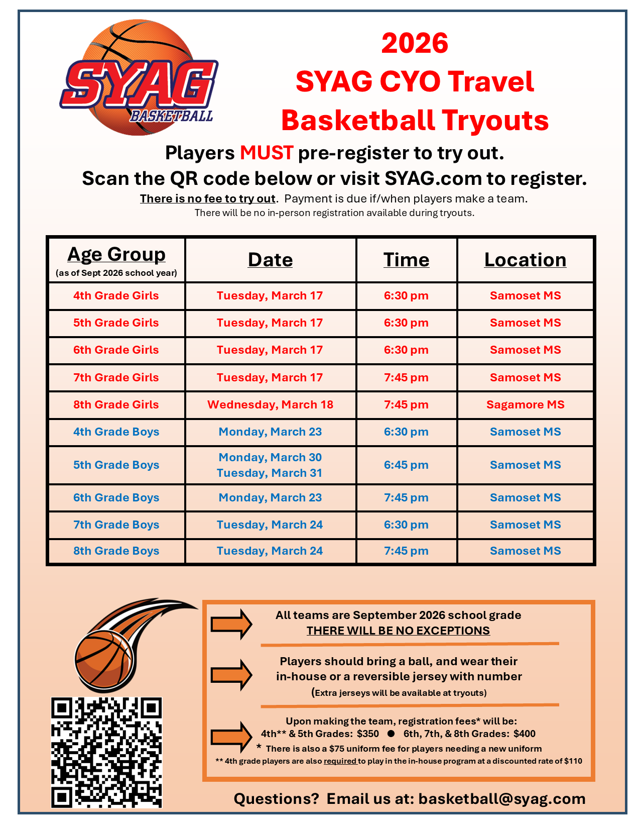 This is for registration, roster, and payment purposes following tryouts. No exceptions will be made.
